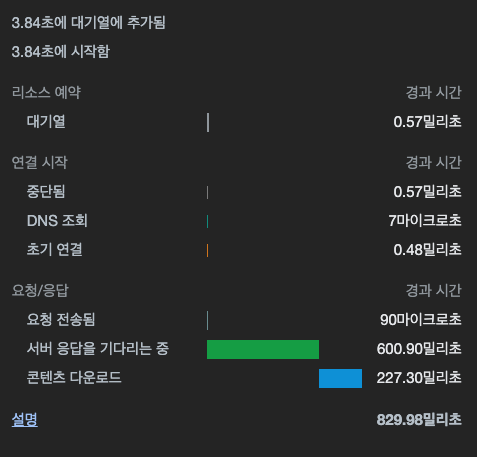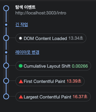 지금이야 개별 섹션 컴포넌트들이 워낙 단순하게 되어있어서 실제 실행해봐도 둘의 차이는 눈에 띄지않습니다. 그치만 수치로 확인은 가능합니다.