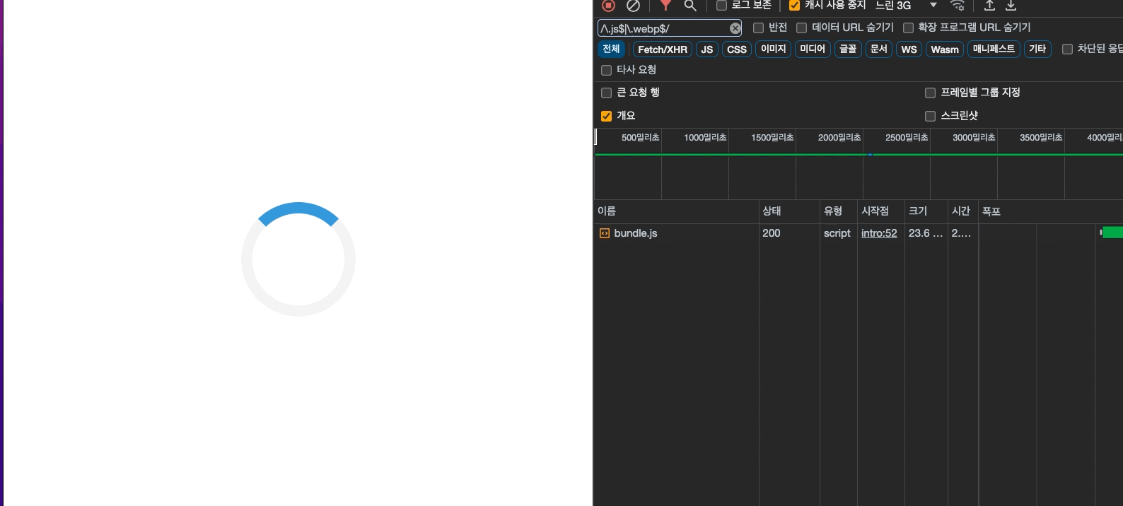 간단한 예제를 만들었더니 성능이슈를 크게 느낄 수 없어서 네트워크탭에서 제약사항을 걸었습니다.